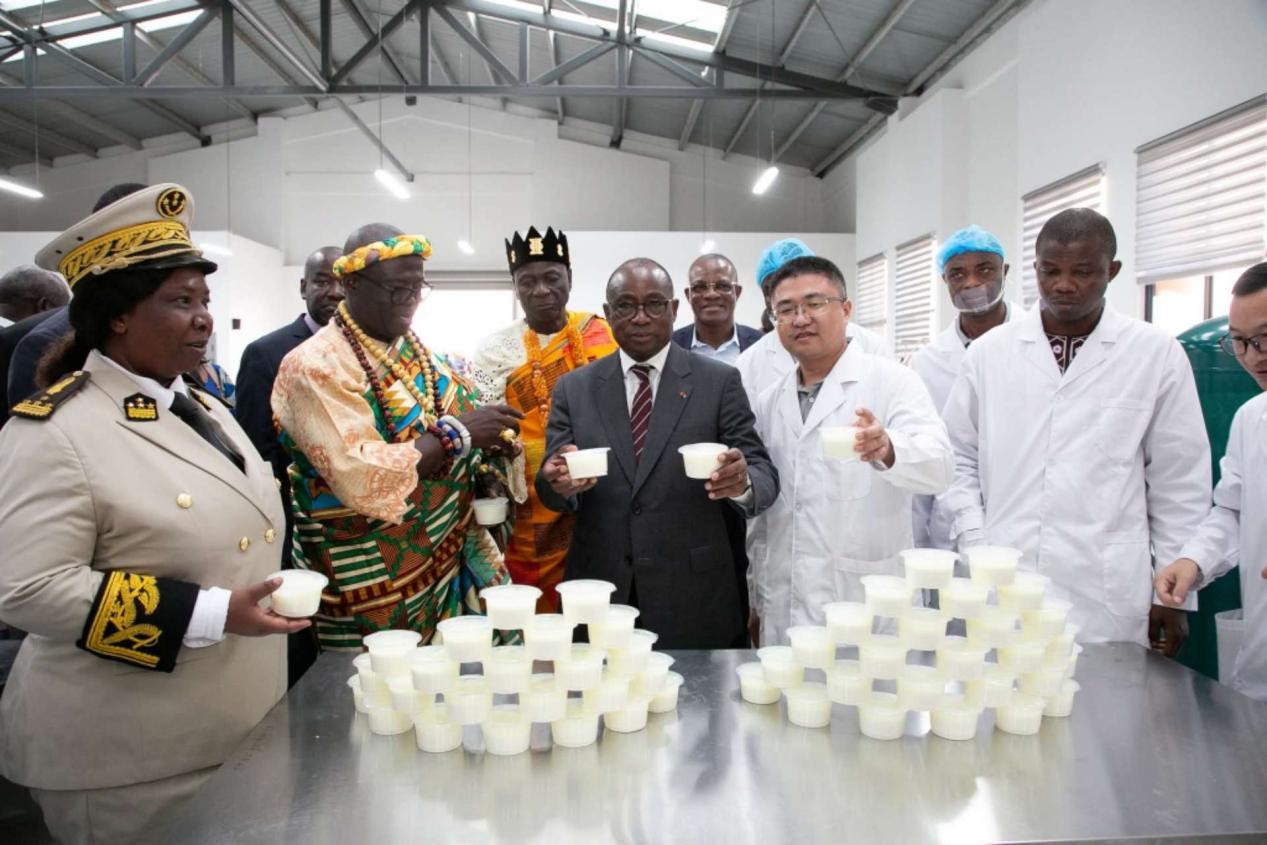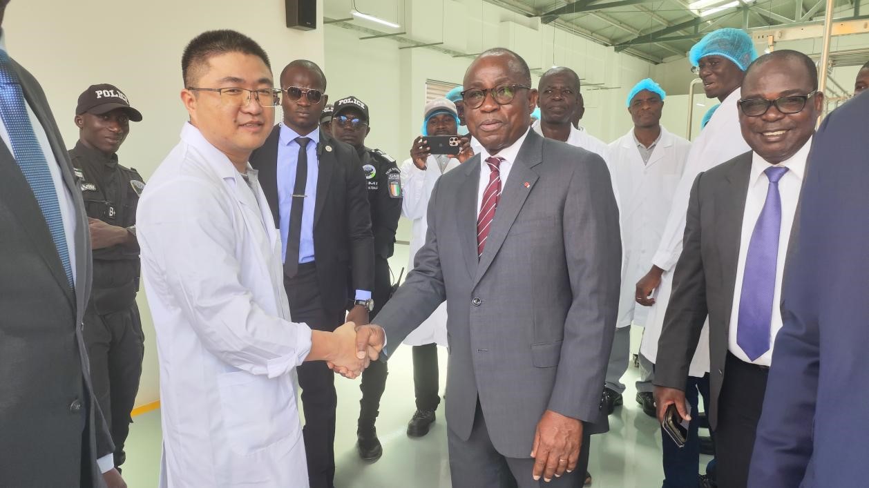 科特迪瓦职教部部长科菲·恩格桑向当地媒体现场展示流体农产品加工产品