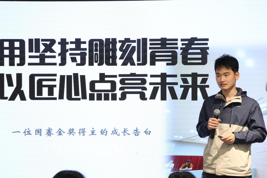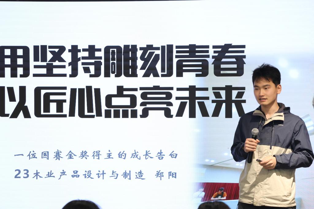 2025年世界职业院校技能大赛轻工赛道金奖、全国院校青年木作技艺竞赛优胜奖获得者郑阳同学以“用坚持雕刻青春,以匠心点亮未来”为题分享了他的成长历程。从最初握刨刀时生疏的双手,到如今在国际赛场上游刃有余地展现精妙技艺,他在木屑纷飞中实现了自己的梦想。