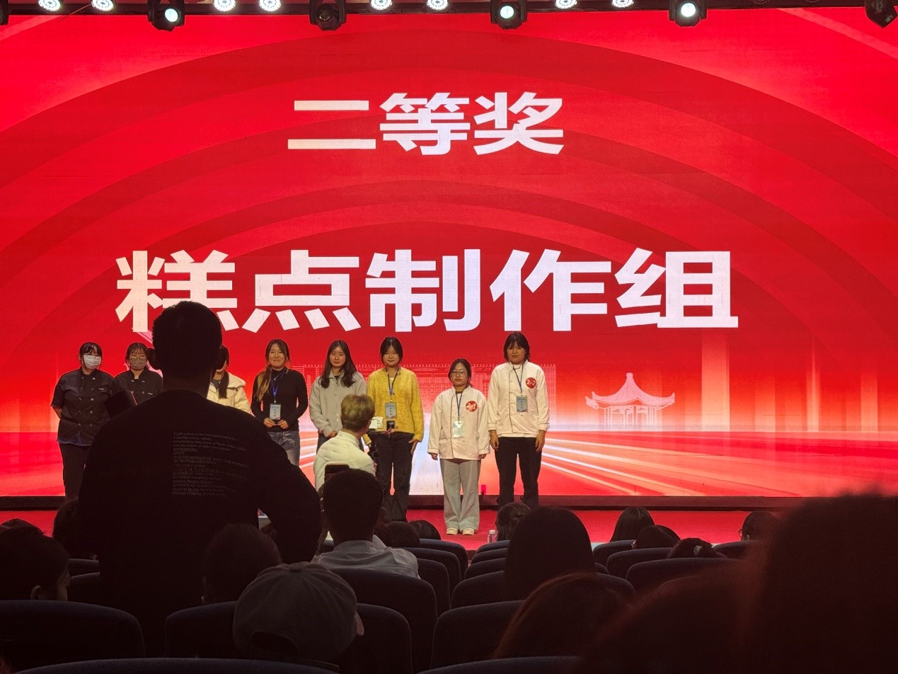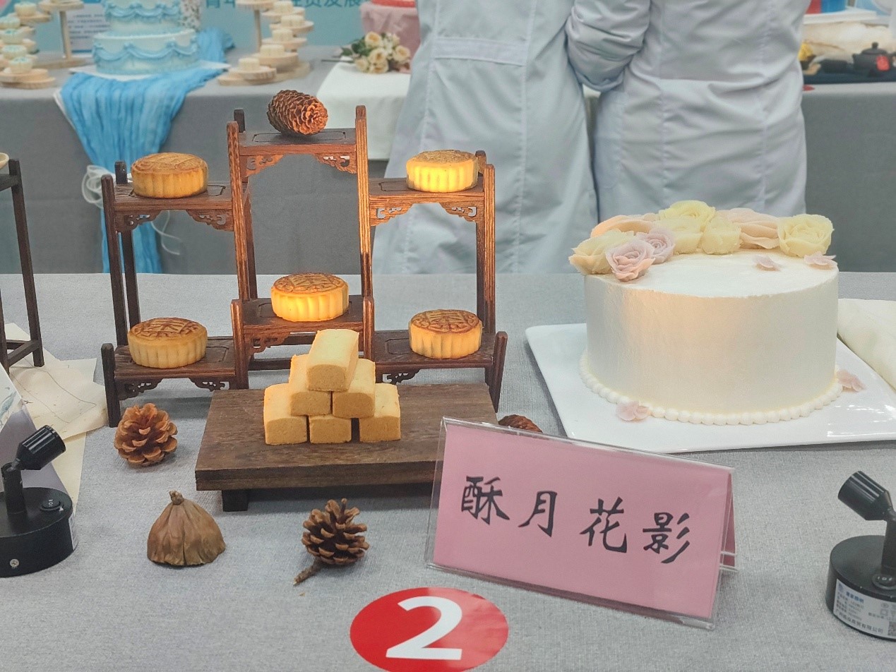本次大赛在江苏食品药品职业技术学院举办,大赛以“融・和”为主题,共有6所院校10组选手参加。大赛要求选手2人一组完成装饰蛋糕及两款中式糕点制作。参赛团队赛前深耕本地当季食材,结合茶食专业特色打磨产品,从创意设计到工艺细节反复打磨。比赛当天,团队在2小时内独立完成制作与摆台,作品既贴合“健康优质”标准,又融入中式美学与茶食风味,契合大赛“弘扬中华美食文化”的主旨。