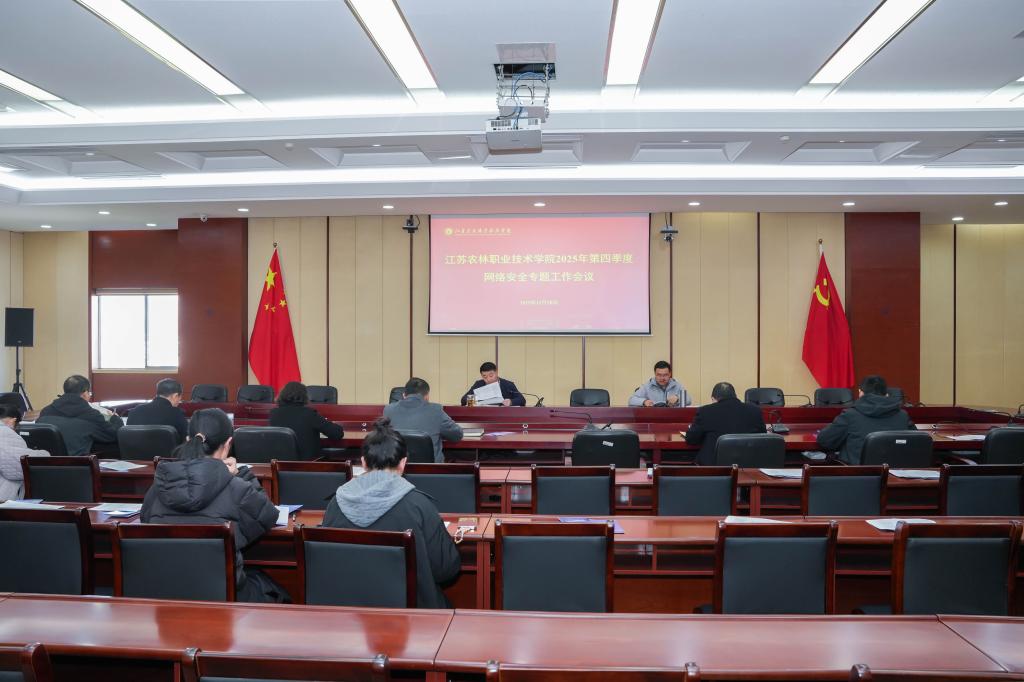 信息工程学院(现代教育技术中心)负责同志对本年度的校园网络安全工作进行了总结汇报,解读《江苏农林职业技术学院信息化项目建设管理规定(试行)》文件,并对2026年信息化项目立项申报工作进行说明;通报了我院2025年春季学期智慧校园成熟度监测情况,并对数字基座数据对接工作进行安排。