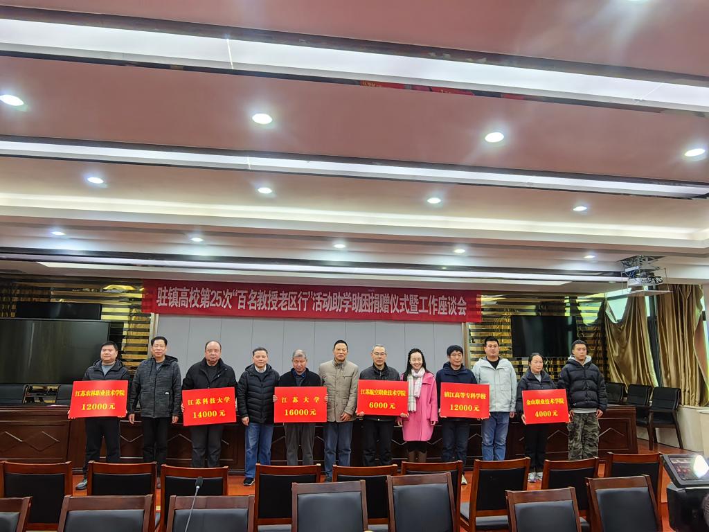 12月13日上午,由镇江市关工委、老促会、总工会和市委老干部局主办,句容市关工委、老促会和天王镇党委、政府协办,江苏大学、江苏科技大学、江苏农林职业技术学院、镇江高等专科学校、江苏航空职业技术学院、金山职业技术学院承办的第25次“百名教授老区行”捐赠仪式暨工作座谈会在天王镇举行。我校关工委常务副主任江德明、秘书长杨春梅参加上述活动。