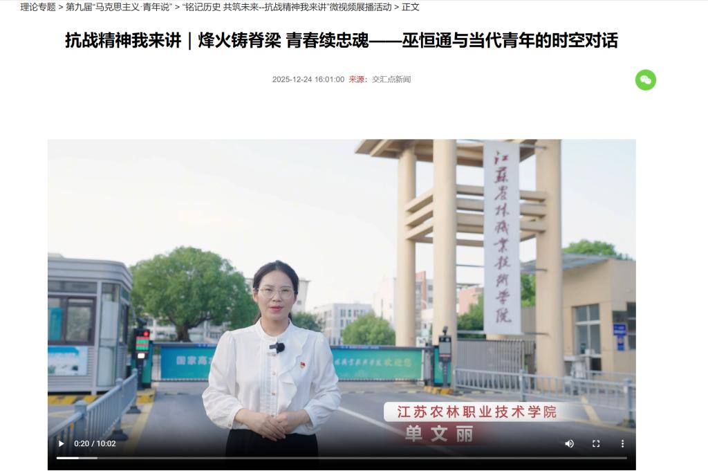 近日,第九届“马克思主义·青年说”系列活动评选结果正式公布。我院团委联合马克思主义学院推荐的单文丽老师的微视频作品《烽火铸脊梁 青春续忠魂——巫恒通与当代青年的时空对话》在“铭记历史 共筑未来——抗战精神我来讲”赛项中表现突出,成功入选全省前20强,并在“学习强国”江苏学习平台、交汇点新闻客户端、中国江苏网及“马克思主义·青年说”微信公众号、抖音号、哔哩哔哩号等官方平台同步展播。