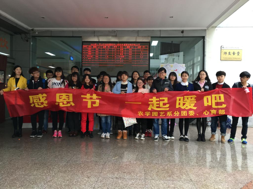 11月24日,农学园艺系分团委、心育部在食堂门口开展了“感恩节—— 一起暖吧”主题团日活动。