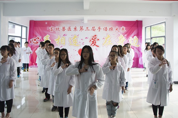 4月13日下午,由畜牧兽医系分团委心育部主办的“心手相连 爱在身边”第三届手语操大赛在研发楼一楼大厅拉开帷幕。全系近500名同学组队参加了比赛。 比赛中,同学们伴随着一曲曲励志向上的歌曲,将感情与意境相融合,肢体语言与心理情感相协调,用优美的手势、多方位的队形变换流露出了真挚朴实的情感,博得在场师生的阵阵掌声。 本次手语操大赛展现了牧医学子青春、健康、向上精神状态,强化了集体观念,在丰富学生校园生活的同时,更提高了学生的综合素质。