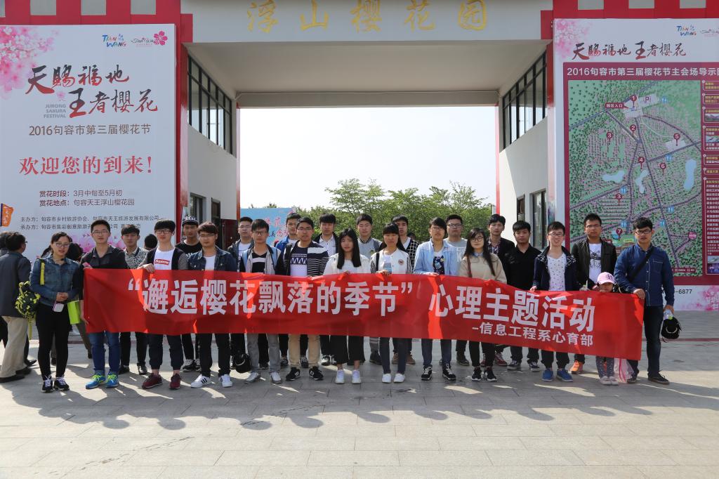为促使学生以健康、快乐、积极的态度面对大学生活,4月17日,信息工程系赴句容天王镇“浮山樱花园”开展了“邂逅樱花飘落的季节”心理健康教育活动。 春暧花开,踏青赏樱正当时,“浮山樱花园”早樱区已是落英缤纷,晚樱区正是繁花闹春。心育干部们在系部心理老师的带领下,尽情领略大自然的美丽。期间,同学们还和句容武术协会进行了太极拳互动交流,不仅锻炼了身体,更发展了友谊。 4个多小时的活动中,同学们用心感悟,积极参与,在享受春天的同时进行了一次心灵的洗礼。