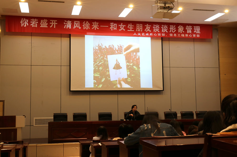 3月23日下午,高级礼仪培训师、高级礼仪(礼宾)师李杨老师应邀为人文艺术、信息工程两系女生做了一场主题为“你若盛开清风徐来——和女生朋友谈谈形象管理”的专题讲座。 讲座中,李杨老师用轻松幽默的语言和丰富的案例、故事从衣着、容貌、姿态、微笑四个方面引导女生们认识美、发现美。她还通过现场互动,直观的讲解了化妆、仪态等内容,并强调女孩子们的衣着打扮应该怎样扬长避短,突出个性,达到协调、合宜、优雅的效果,受到在场女生的的热捧。