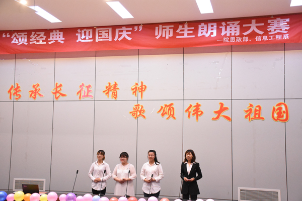 9月28日下午,学院思政部和信息工程系在研发楼报告厅联合举办了“颂经典 迎国庆”为主题的师生组合诗歌朗诵友谊赛。大一新生们和各自的老师组队参赛,他们声情并茂,感情饱满真挚,爱国主题鲜明,给在场观众极强的感染力。最终,经过评委认真评选,乔小倩老师组合、丁志春老师组合荣获一等奖,陈立娥老师组合、张媛老师组合等分列二、三等奖。此次大赛也是向红军长征胜利80周年和即将到来我们伟大祖国67岁生日的献礼。