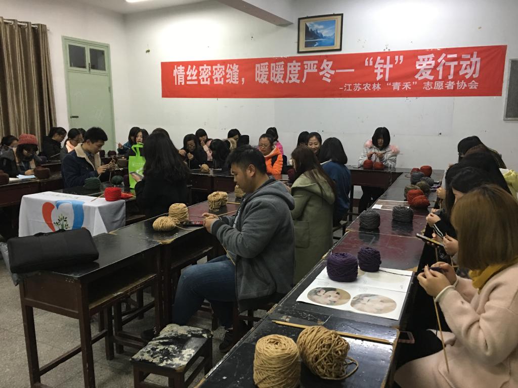 学院团委组织院学生会和“青禾”志愿者协会分别开展了感恩活动。上午7点,院学生会的同学们早早聚集在梧桐路旁,帮助阿姨清扫梧桐路段的落叶。同学们不畏寒冷,手持笤帚和簸箕等工具,将梧桐路的落叶清扫干净,给冬日的校园了增添一份靓丽的“人文”风景。晚上18点,“青禾”志愿者协会的志愿者们在理科楼教室内举行“情思密密缝,暖暖度严冬”——“针”爱行动。此次活动,共招募了50名校内志愿者,由院团委提供针、毛线、爱心卡片等所需物品,志愿者们认真学习针织围巾,围巾成品将送给句容市的孤寡老人。同时,学院团委与徐州睢宁县扶佑助残协会通力协作,也将这份温暖送去苏北。