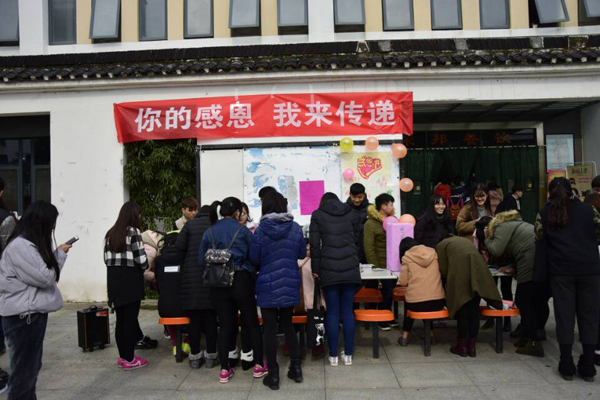 风景园林系举办了系列“知恩于心,感恩于行”感恩节系列活动。21日,志愿者们帮助宿管阿姨分担日常打扫工作,并赠送了阿姨生活照集锦装饰她们的宿舍。22日,志愿者们来到句容市崇明小学,向同学们讲述传统的感恩美德故事,并利用同学们从家收集来的闲置纽扣、布片、铁丝,通过志愿者们的帮助变成了漂亮的纽扣花,让同学们在感恩父母、师长的同时也学会感恩环境,不随意破坏我们赖以生存的地球。23日,志愿者为同学们准备了“爱传万里”、“你心意,我传递”和“时光胶囊”三个“快递箱”,让同学们超越时间、空间传递自己的祝福与感恩。