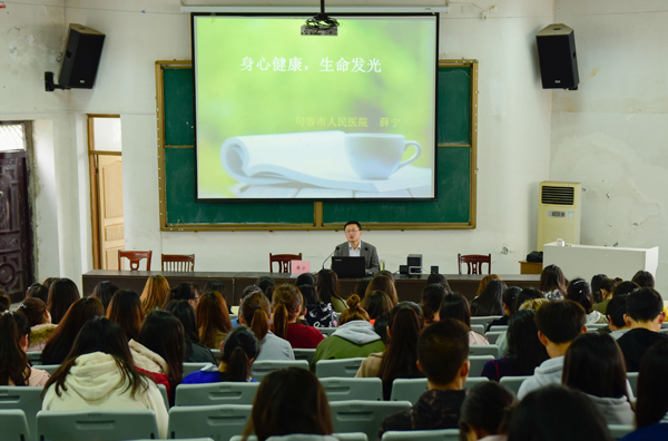 为增强广大学子的健康观念和防病意识,4月5日下午,茅山校区在学术报告厅开展主题为“身心健康 生命发光”的知识讲座。 本次讲座邀请了句容市人民医院团委书记薛宁前来开讲,薛医生首先根据大学生日常生活习惯特点,向同学们普及了春夏季常发疾病、预防措施、养生保健等知识。随后,他又介绍了吸烟、酗酒、营养不平衡、运动不足、应急能力下降等几种全球最不健康的生活方式导致的恶性后果。最后,薛医生呼吁同学们要形成良好的生活习惯,才能保持身心健康。