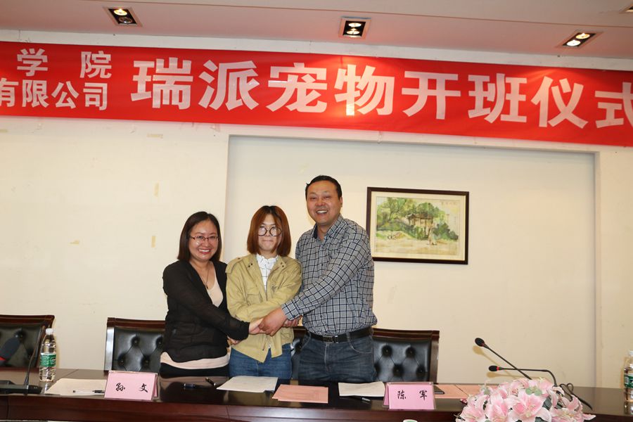 之后,学生代表、企业代表以及学院代表签订了三方协议。全体与会人员进行了合影留念,共同见证了第一届“瑞派宠物”订单班的成立。