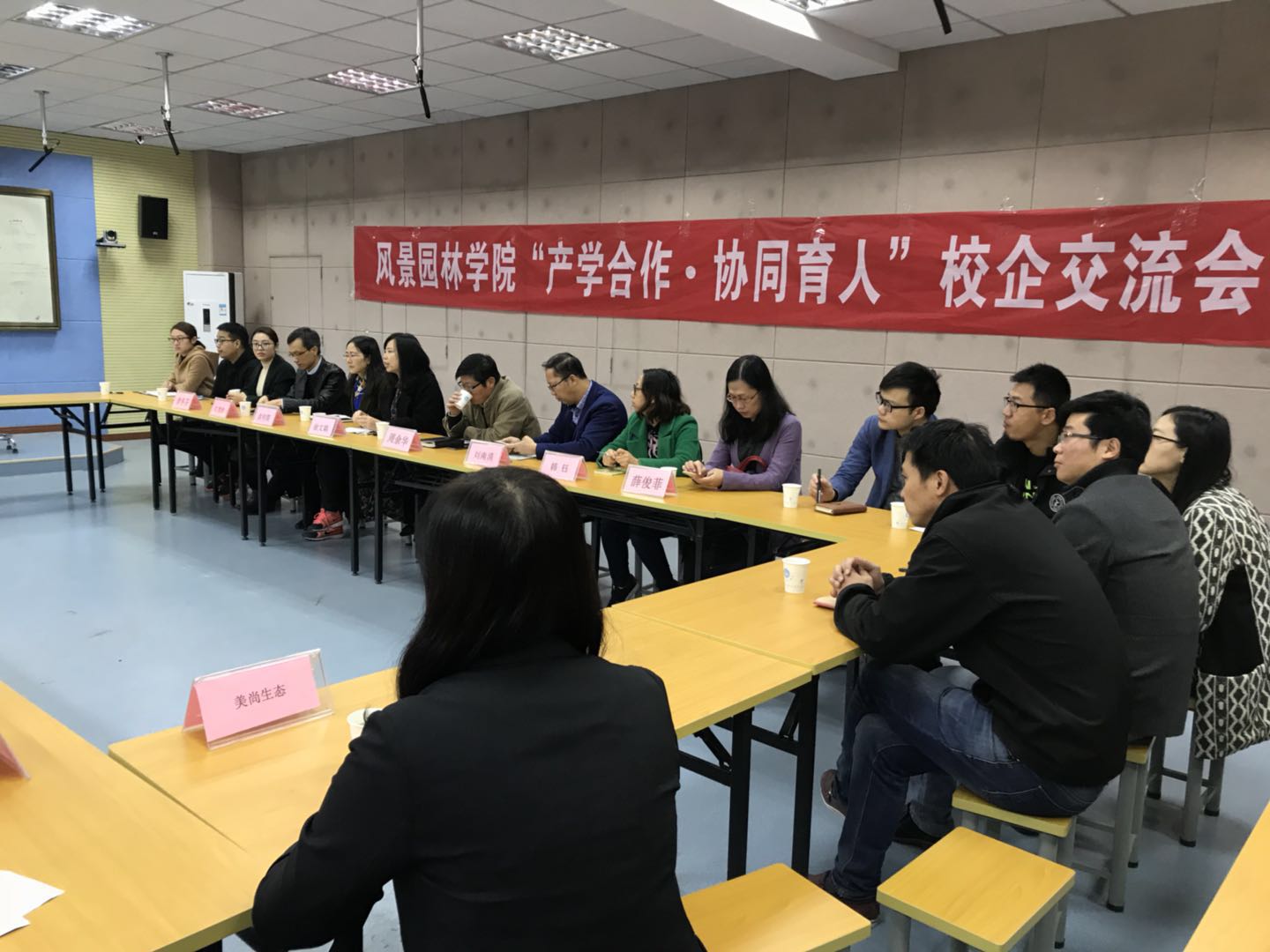 11月18日上午,风景园林学院召开 “产学合作·协同育人”研讨会,就各专业校企合作现状、人才培养方案、现代学徒制试点运作情况等范畴进行研讨。江苏凯进生态环境有限公司、大千生态景观股份有限公司等11家企业代表,风景园林学院园林建筑等六个教研室教师代表参加会议。