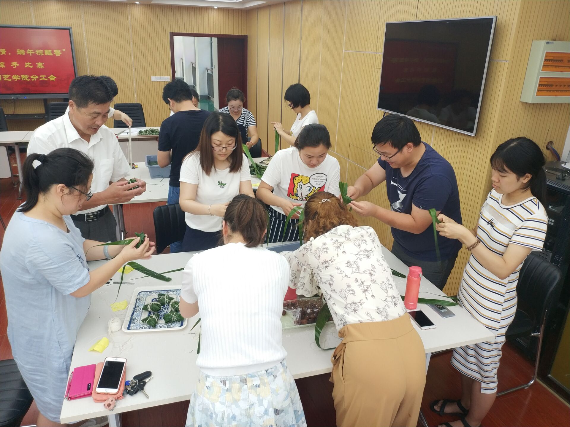 为传承中国传统文化,丰富教职工业余生活,农学园艺学院分工会于6月15日下午在研发楼二楼会议室举行了“和睦农艺情,端午粽飘香”包粽子比赛,学院共30位教职工参加了此次活动。
