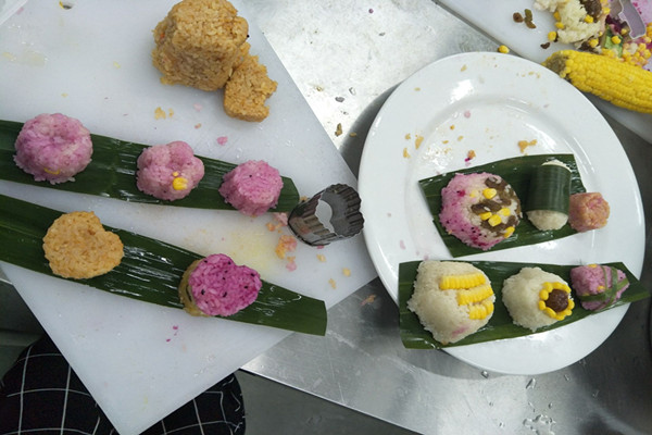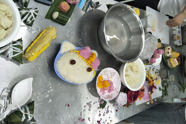 活动中,果蔬创意社团同学们给大家送出节日祝福,并整齐摆放出粽叶、糯米、玉米粒、葡萄干等食材,现场教授大家包各种创意粽子,大小、形状各异。制药E族社团同学们精心准备了很多香囊,给大家一一戴上,还给大家系上彩线,讲解了端午节的传统习俗。大家围坐在一起,现场气氛喜庆热烈。