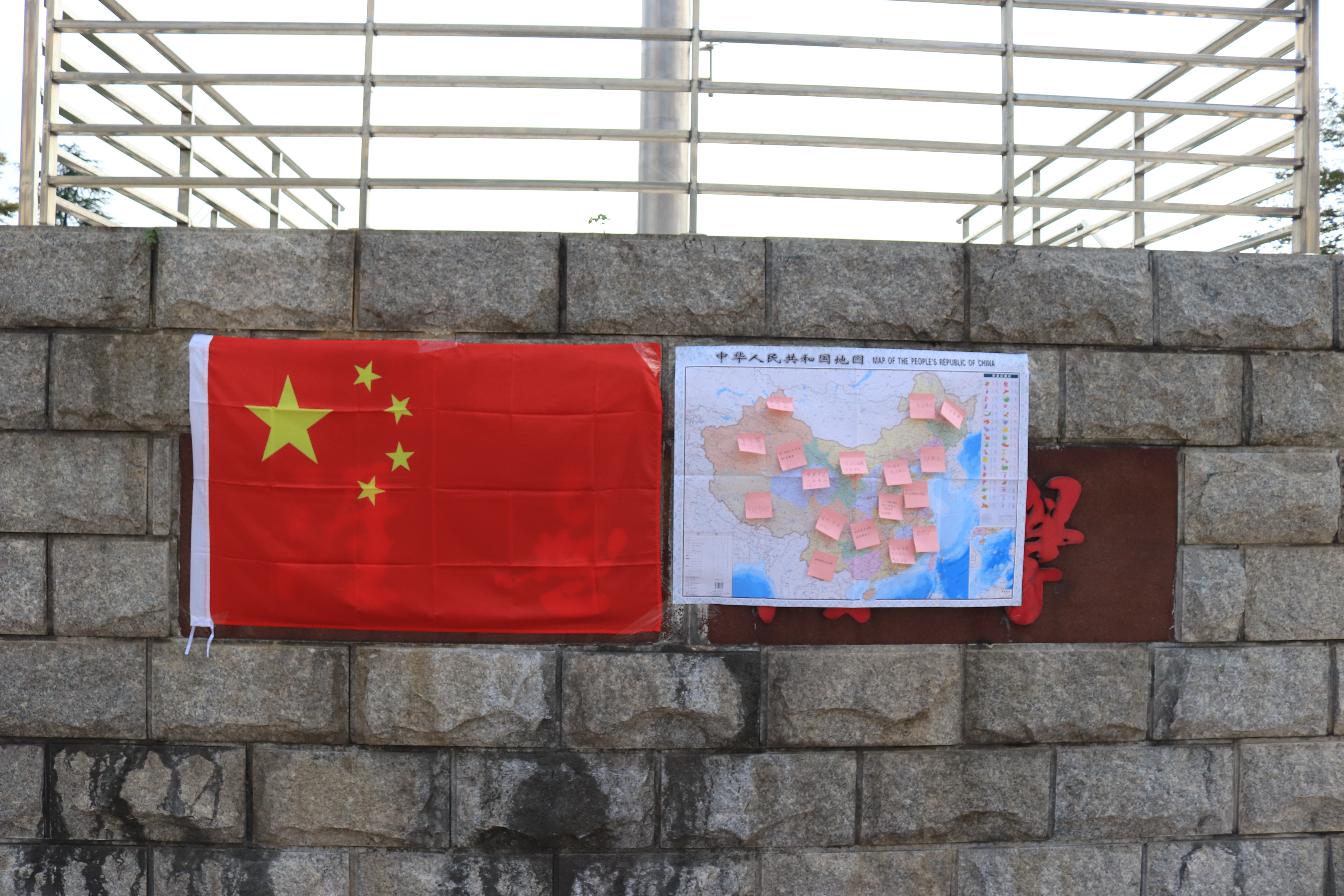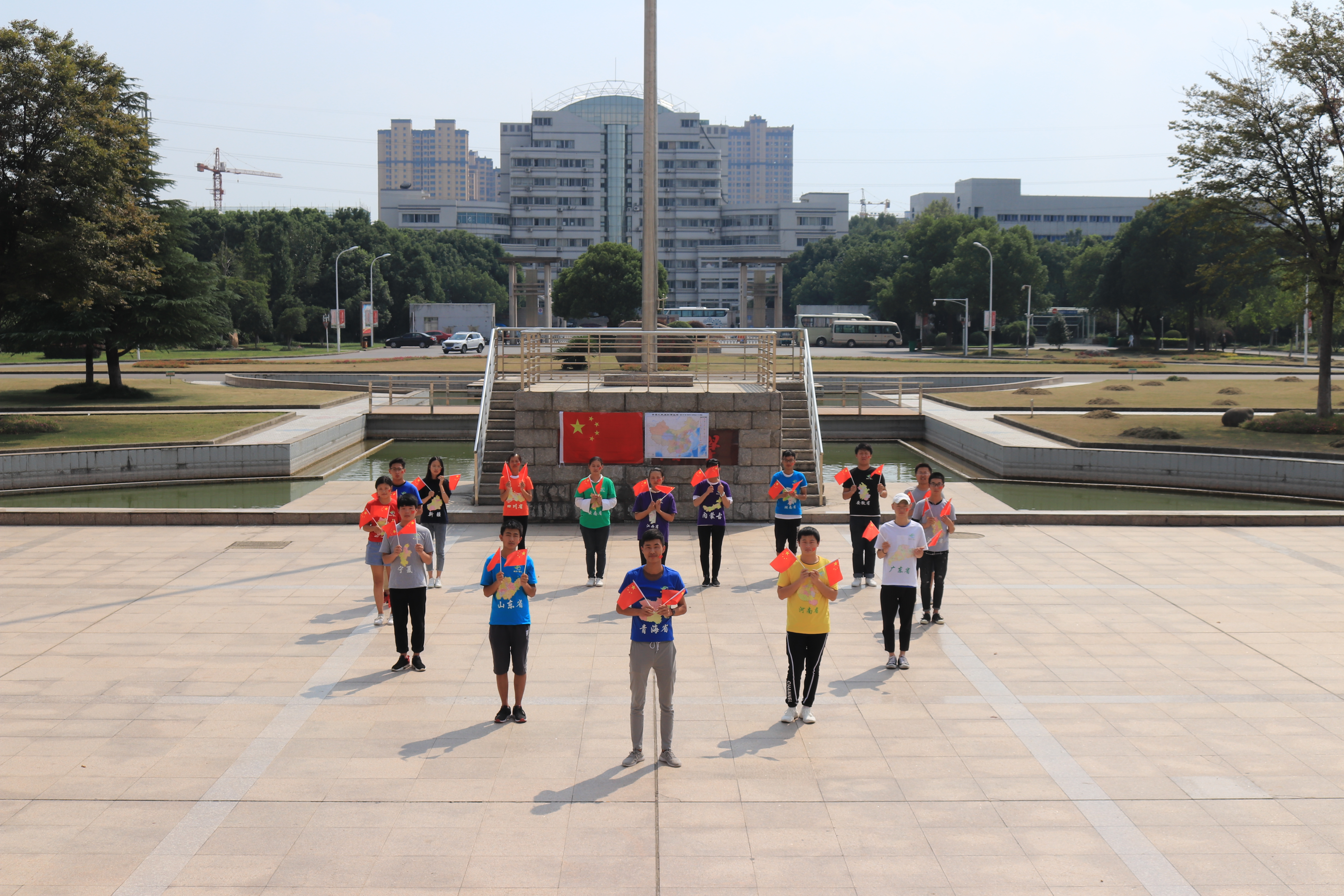 在“国旗在飘扬”升旗仪式正式开始后,全体师生注目着冉冉升起的国旗,大声唱着国歌,表达着无限的敬意。“我和国旗合影”环节,大家手执小小的五星红旗,在镜头前露出灿烂的微笑,来表达对祖国的热爱,传递青春正能量。在“一颗心 一双手 共绘祖国蓝图”中,新生共同拼出“中国”,寓意着祖国的发展需要我们团结一心,美好的未来需要每一个人的双手共同来创造。来自不同省份的学子们还把自己对祖国的祝福语贴在了“中国地图”的寄语板上,这些祝福语字里行间抒发着对祖国的热爱。最后,活动在新生嘹亮的口号“我以我心爱祖国 我以我行报祖国”中圆满结束。