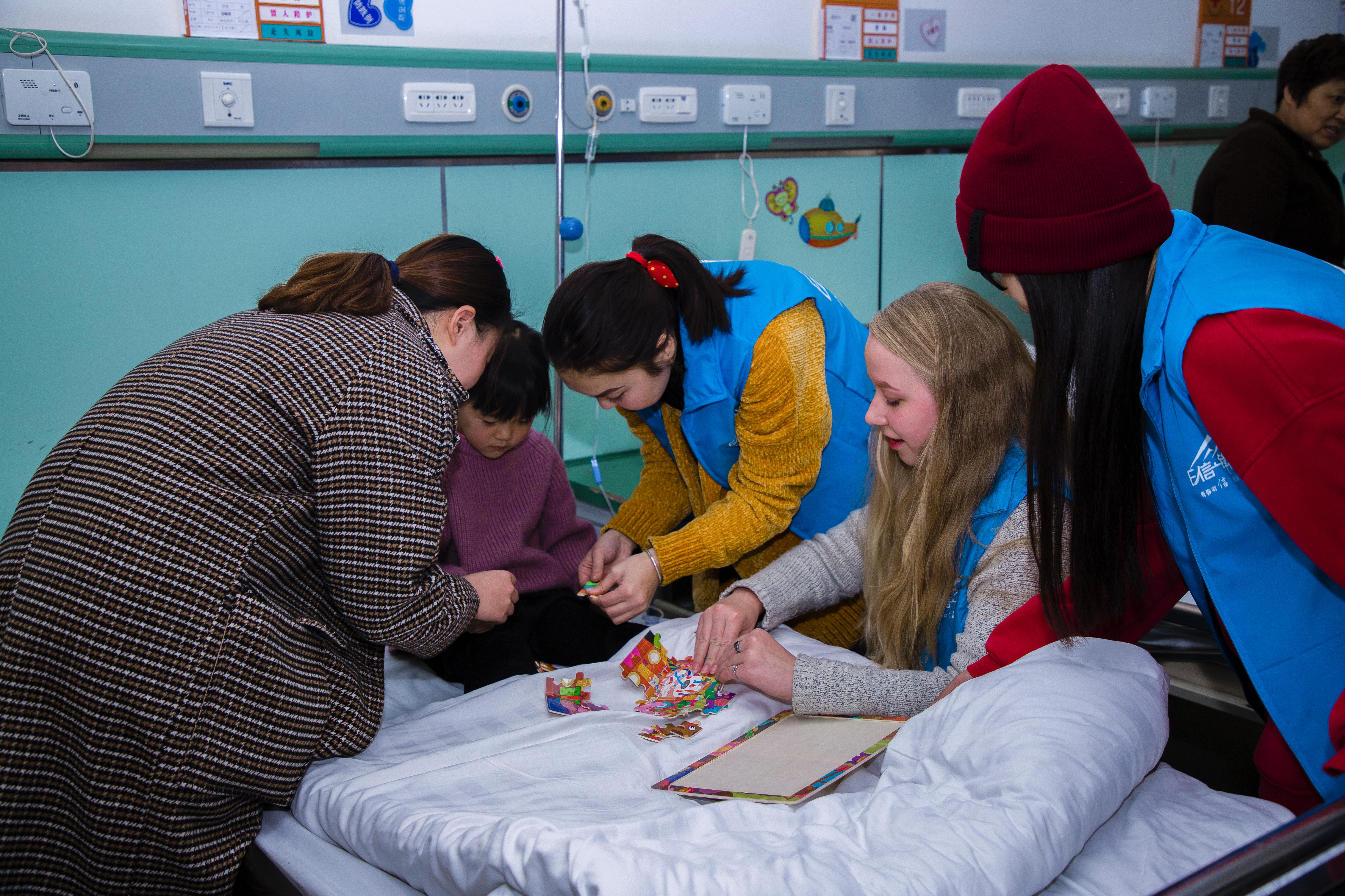 在医护工作人员的指导下,志愿者们认真学习相关医护知识,之后分别来到儿童住院部和老年人康复中心,留学生志愿者们陪小朋友做游戏、分享故事,帮助患儿缓解疾病带来的痛苦。在老年人康复中心,志愿者协助医护人员为老人按摩腿脚,在点滴生活中传播文明,在平凡服务中彰显风采。