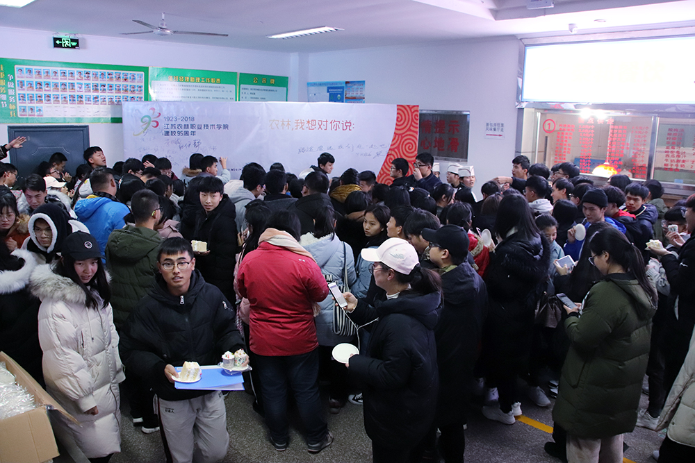 活动中,由食堂面点师傅制作的校庆生日蛋糕长1.6米,点缀着学院的标志性元素和95周年校庆图案,同时茶与食品科技学院烘培社团也用自己制作的小蛋糕拼写成“JSAFC95”字样祝贺学院95周年校庆。在品尝了校庆生日蛋糕后,师生们纷纷在签名墙上郑重写下多农林的祝福,表达了他们的美好祝愿。