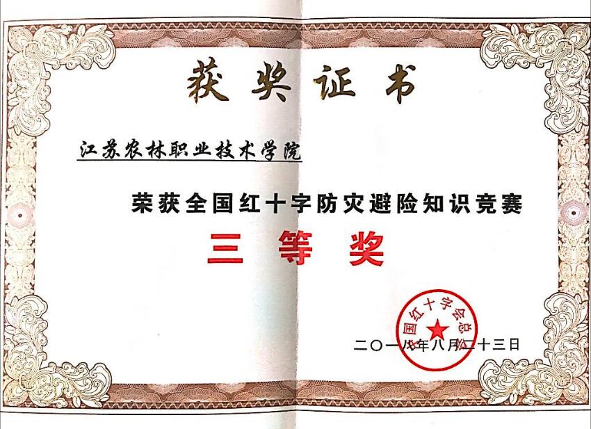 近日,由中国红十字会总会主办、总会报刊社承办的“2018年全国红十字防灾避险知识竞赛”结果揭晓,江苏农林职业技术学院荣获三等奖。