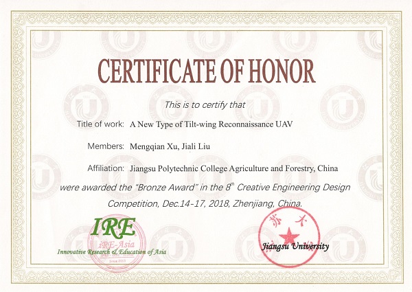 参与本次竞赛的共有来自15所大学的47组参赛队伍。我院肖子勤、许亚龙的作品“室内空气净化专家”,徐梦倩、刘佳丽的作品“一种新型的倾转旋翼无人机”,经过现场展示和汇报比拼获得铜奖的好成绩。