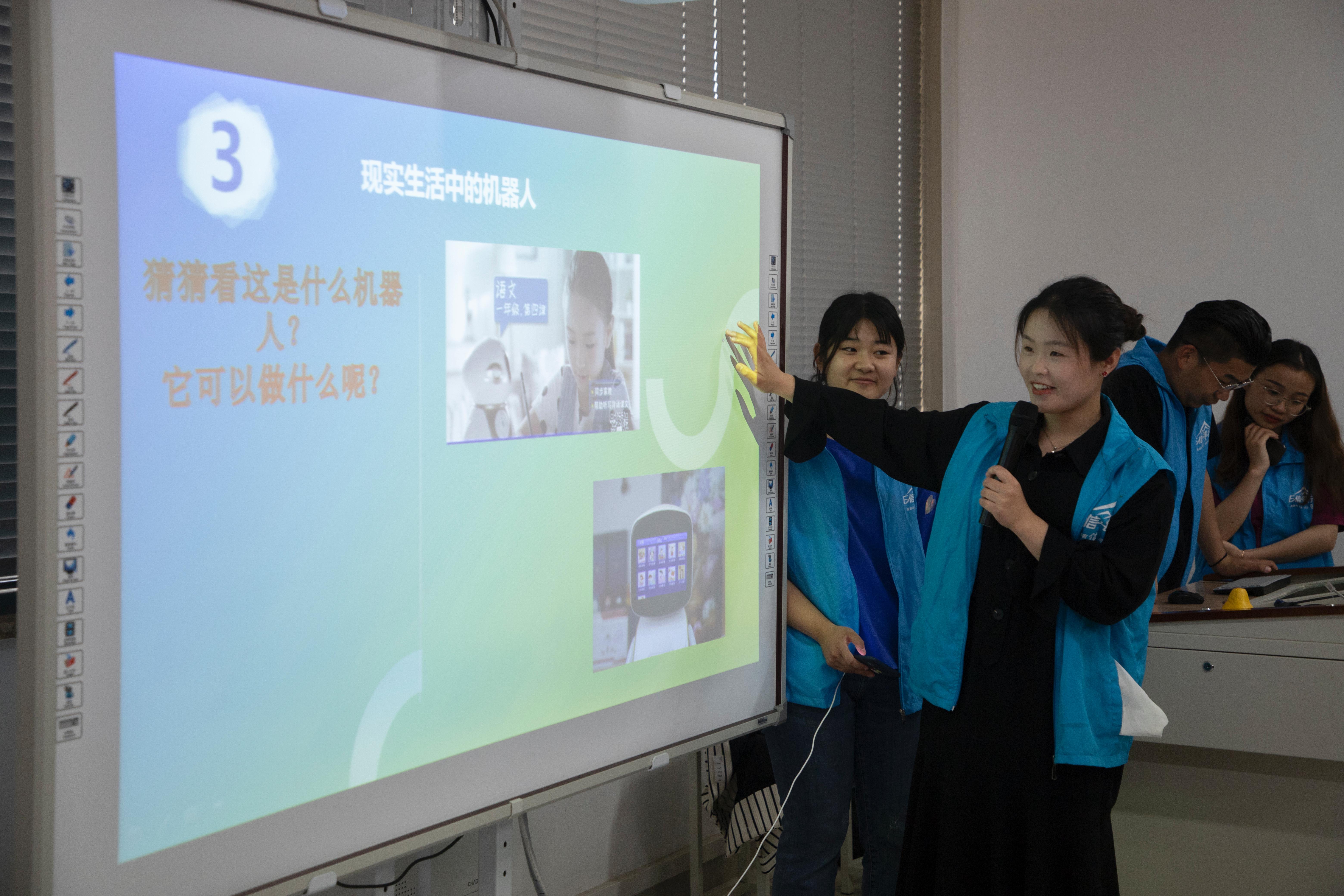 本次活动主要分为“家长沙龙”“沙盘游戏”“法院小课堂”“亲子游戏”和“科技启蒙课堂”五个环节。信息工程学院“太阳花”假日课堂10余名志愿者来到了句容市未成年人指导中心,陪同孩子们一起做起了沙盘游戏,帮助他们认识自我,增进与父母之间的沟通交流;随后,志愿者们带着孩子们来到了句容市人民法院,参观了青少年法庭,学习了相关青少年保护法律知识;下午,志愿者们将假日课堂搬进实验室,给他们讲授了一堂科技启蒙知识课。互动式的机器人知识讲解,融入机器人舞蹈,引起孩子们对机器人极大的兴趣;孩子们兴高采烈地带着VR眼镜看穿越机特技飞行,科技启蒙课在无人机桨叶的轰鸣声中结束。