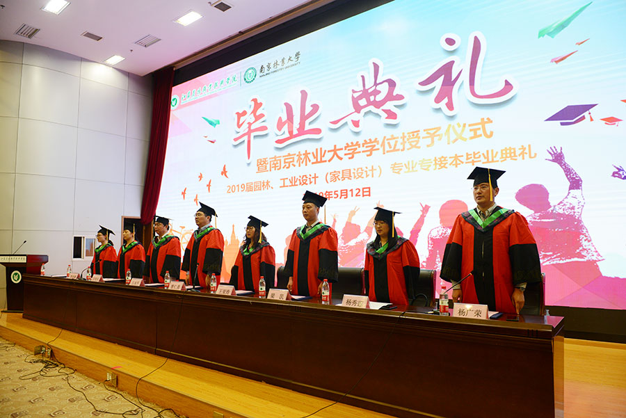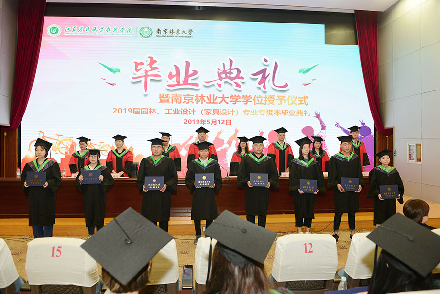 典礼在庄严雄壮的国歌声中拉开帷幕。曹仁勇副校长代表学院首先致辞,他饱含深情地与毕业生们同叙在校期间的学习和生活,表达了对他们的良好祝愿。同时,代表母校对毕业生们提出了殷切期盼!毕业生代表岳子豪同学在发言中倾述着对母校的不舍之情和对未来的期待。教师代表曹丽娜老师分享了任教以来的师生情,并送上自己美好的祝愿。南京林业大学风景园林学院园林植物系主任杨秀莲、家居与工业设计学院家具设计系主任苗艳凤分别宣读了毕业批复决定、学位授予决定等相关文件。主席台导师为毕业生代表援正流苏、颁发学士学位证书,并合影留念。