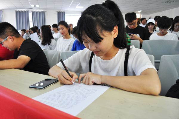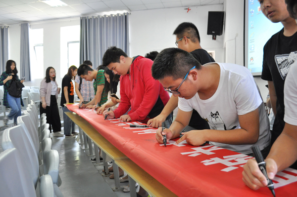 王庆老师针对个人征信及贷款还款等问题进行逐一讲解,并通过生动详实的事例和播放《诚信还贷》视频阐述了诚信的重要性,同学们在老师的指导下签署了《诚信还贷倡议书》,并在横幅上签字留念,坚定诚信还款信念。