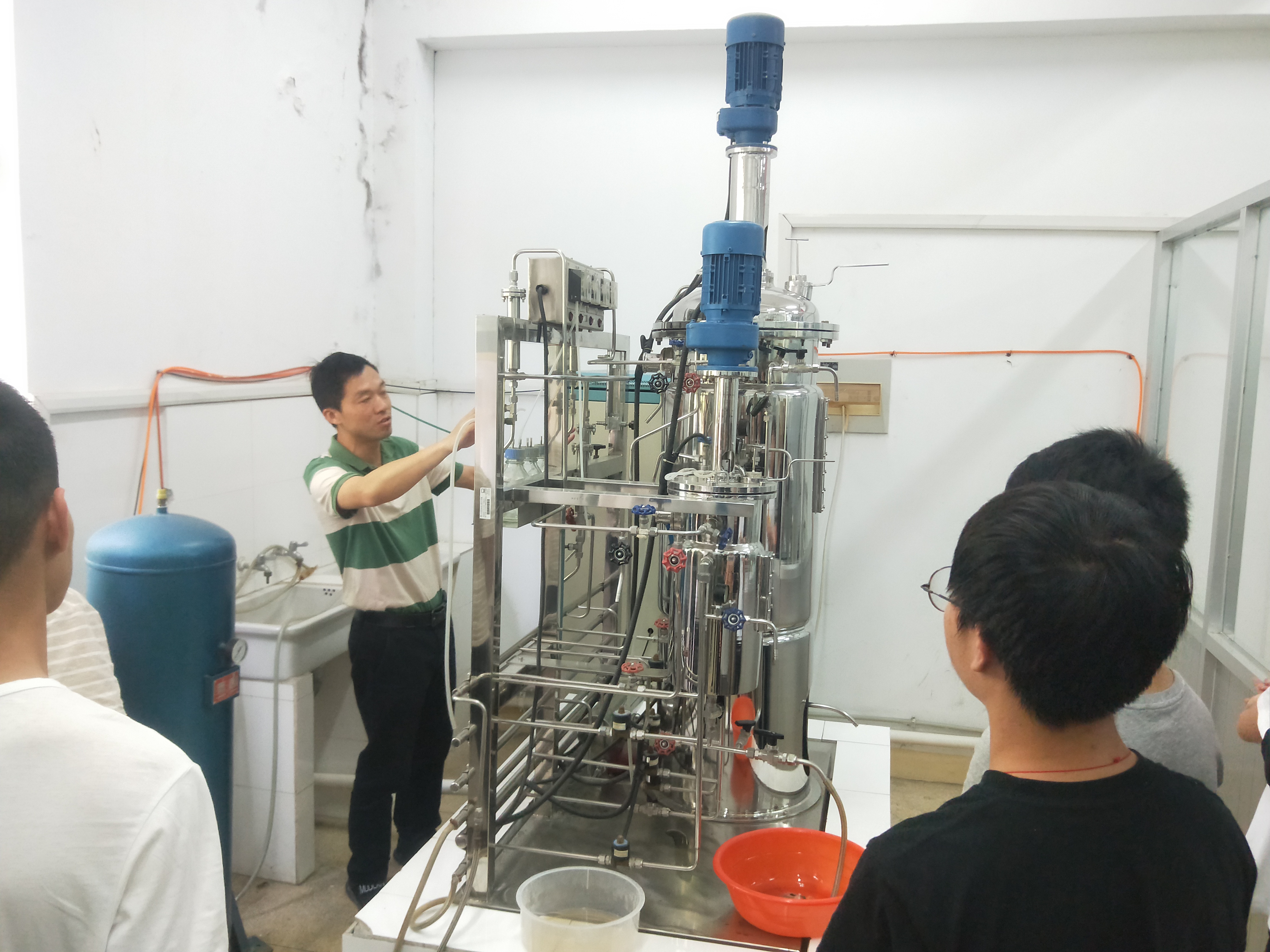 发酵罐指工业上用来进行微生物发酵的装置,能耐受蒸汽灭菌,有一定操作弹性,内部附件尽量减少,物料与能量传递性能强,并可进行一定调节以便于清洗、减少污染,适合于多种产品的生产以及减少能量消耗。活动中,发酵社团指导教师黄小忠对发酵罐各部分功能进行了讲解,并对发酵罐的使用步骤进行了介绍,邀请了数位同学进行了实际操作,指出了同学们操作不规范的地方,同时对存在的危险因素着重强调。此次活动,加深了同学们对发酵罐的认识,丰富了同学们的课余生活,也加强了团队的凝聚力。