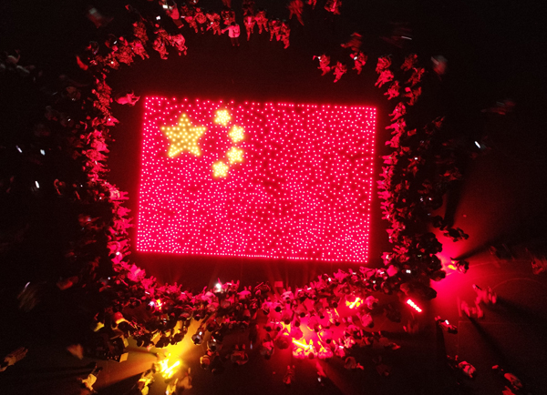 当《红旗飘飘》歌曲响起,500余名身着军训服装大一新生,手持红、白色蜡烛,一起“点亮”国旗。不到10分钟,一幅9米×6米的五星红旗映入眼帘,引得现场师生的一片赞叹。随后,在场的师生手摇小国旗齐唱《我爱你,中国》,深情告白祖国,献礼新中国70华诞。