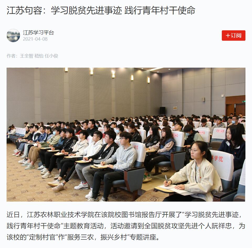 近日,江苏农林职业技术学院在该院校图书馆报告厅开展了“学习脱贫先进事迹,践行青年村干使命”主题教育活动,活动邀请到全国脱贫攻坚先进个人阮祥忠,为该校的“定制村干”作“服务三农,振兴乡村”专题讲座。