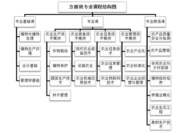 “方源班”在校期间要修读的课程分为文化课、专业基础课、专业四模块现代农业课程。根据行业企业的岗位需要,确定《作物栽培》《植物保护》《农业信息技术与信息管理》《农业机械应用技术》《农业企业经营与管理》课程为专业核心课程。