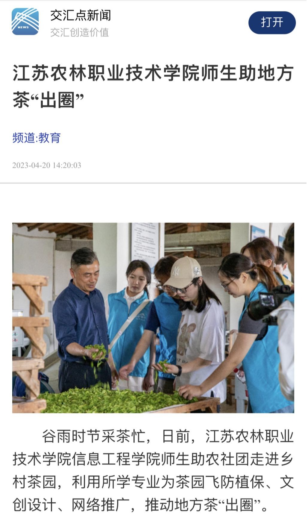 谷雨时节采茶忙,日前,江苏农林职业技术学院信息工程学院师生助农社团走进乡村茶园,利用所学专业为茶园飞防植保、文创设计、网络推广……推动地方茶“出圈”。