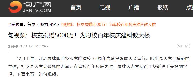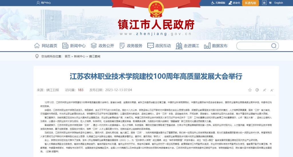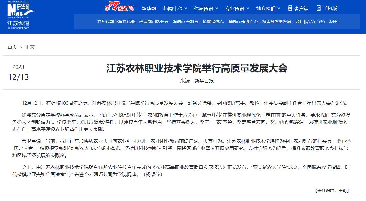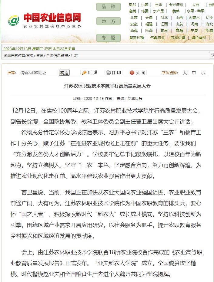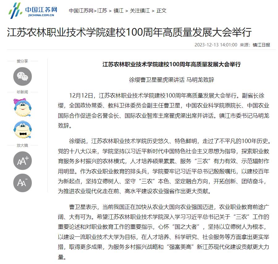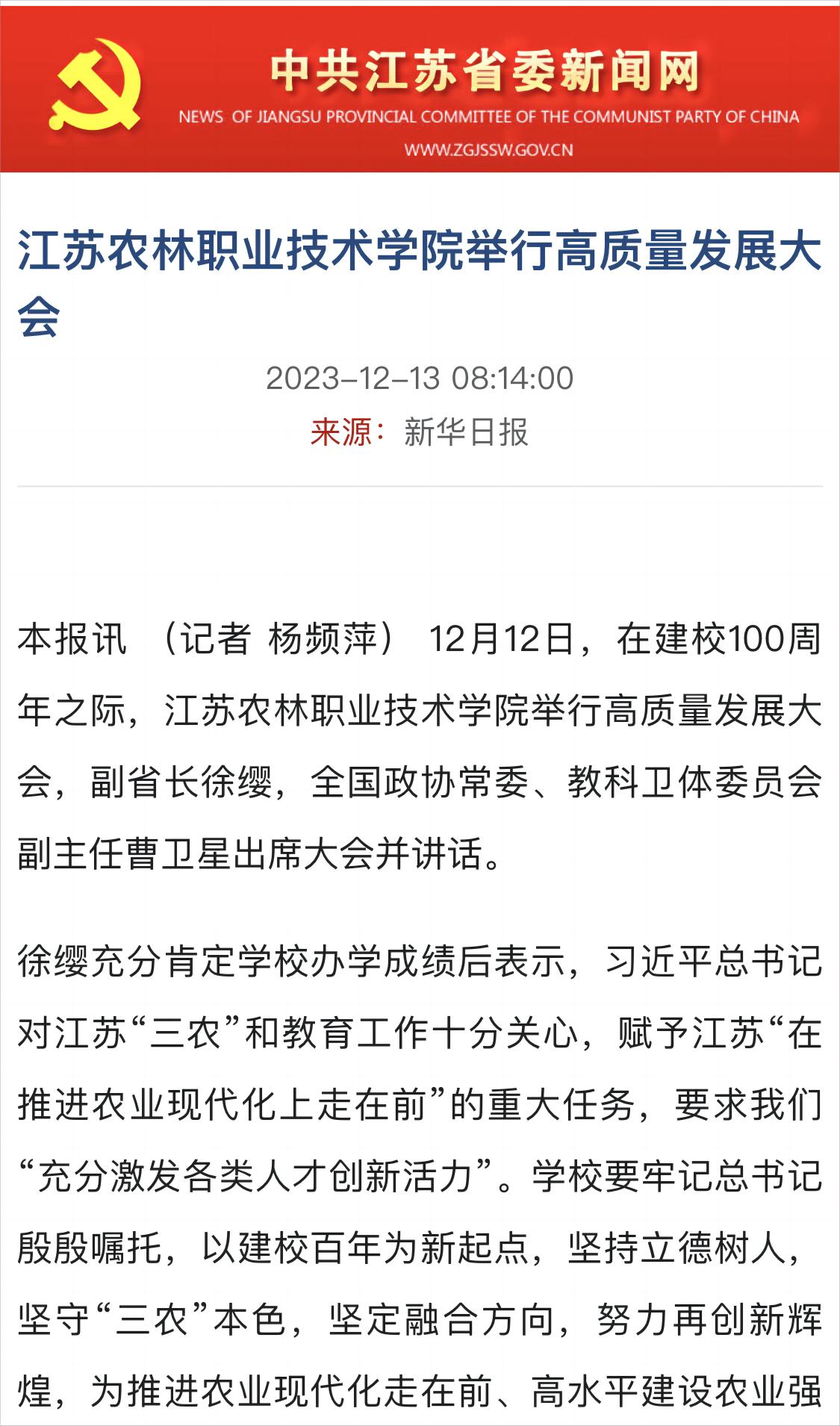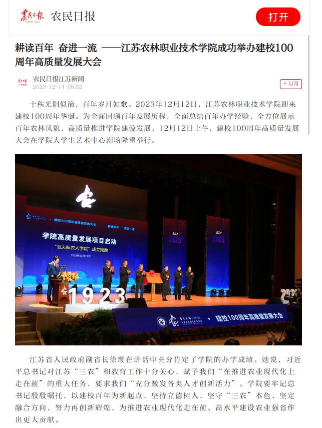 2023年12月12日,江苏农林职业技术学院迎来建校100周年华诞。农民日报、新华网、新华日报、中共江苏省委新闻网、江苏卫视、荔枝网、交汇点、中国江苏网、中国农业信息网、镇江日报、镇江新闻、句视频等多家媒体平台聚焦关注学院校庆盛况,微博超话阅读量达122.4万,当日短视频阅读量达15万次。