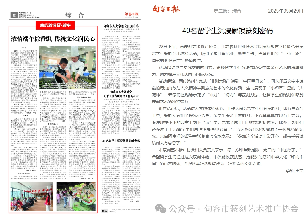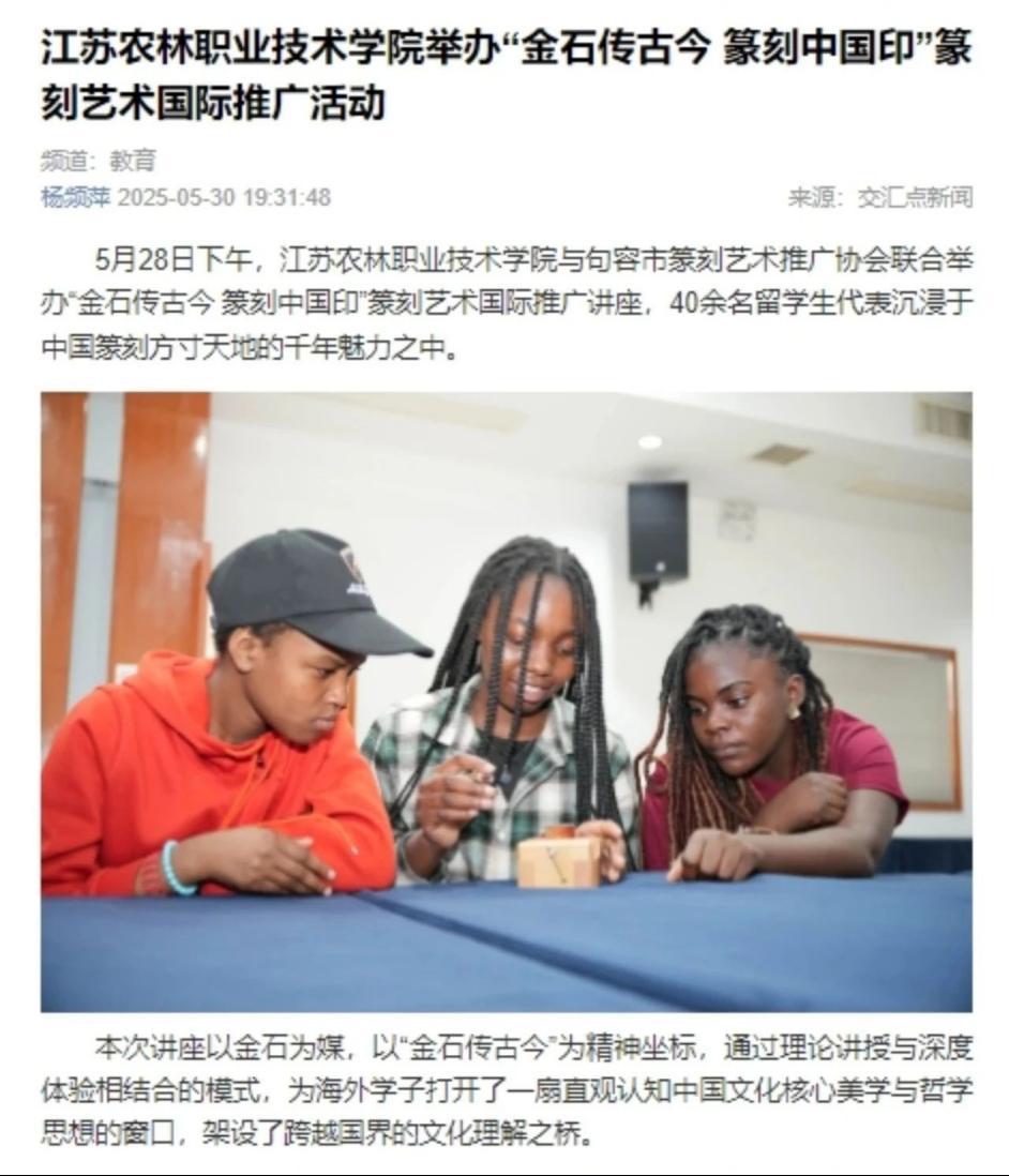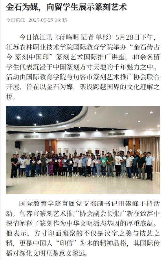 近日,我院联合句容市篆刻艺术推广协会开展的“金石传古今 篆刻中国印”篆刻艺术国际推广活动受到江苏省内多家主流媒体的关注和报道。新华日报·交汇点、今日镇江、句容日报等媒体纷纷聚焦此次活动,展现了我院在促进中外文化交流、助力留学生深度体验中国文化方面的积极成果。