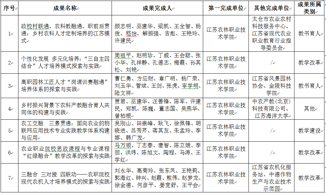 根据《关于公布2020年学院教育教学成果奖获奖名单的通知》(苏农林院[2021]85号),经过整合与凝练、专家评审、报学院党委会审定通过,我院拟推荐7个项目申报2021年江苏省教学成果奖(职业教育类),现予公示。