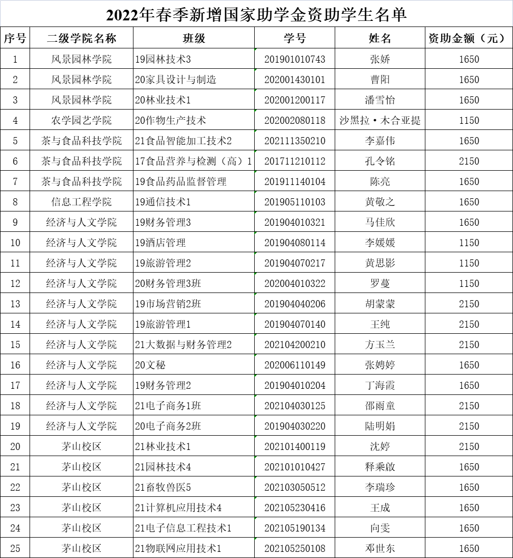 根据《省教育厅省教育厅关于做好2021年普通高校国家奖助学金有关工作的通知》(苏教助函〔2021〕12 号)和2022年春季省文件要求,2022年春季经本人申请、班级推荐、二级学院初审,学校最终审核,新增25名同学申报国家助学金予以公示。对以下同学如有异议,请于2022年5月13日前到学生工作处孙鑫老师或孙颖老师处反映,反映问题要实名且提供相关材料,对于匿名反映或没有具体材料的反映将不予受理。公示期结束后,将不再受理相关反映。地点:综合楼207室;联系电话:0511-87290202;邮箱:jsnlzz@163.com。