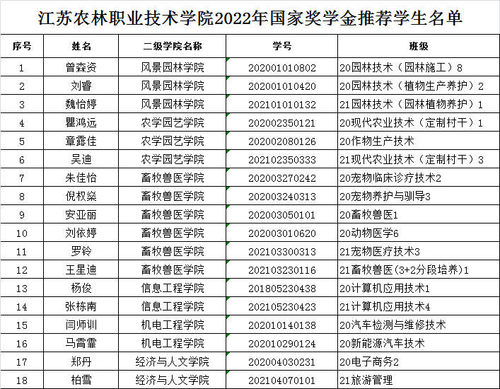 根据《省教育厅关于做好 2022年普通高校国家奖学金有关工作的通知》(苏教助函〔2022〕9号)和《江苏农林职业技术学院国家奖学金管理实施办法》文件精神,经本人申请、班级推荐、二级学院初审,学院最终审核,现拟推荐以下18位同学申报国家奖学金,现予以公示。对以下获奖同学如有异议,请于2022年10月26日前到学生资助管理中心孙颖老师处反映,反映问题的同学要实名并且提供相关证明材料,公示期结束后,不再受理相关反映。地点:综合楼207室;联系电话:0511-87290202;邮箱:jsnlzz@163.com。