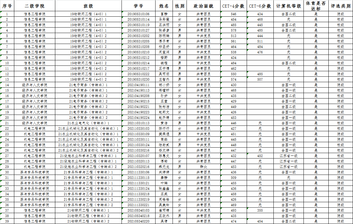 经班级推荐、二级学院初审、学生工作处审核,现拟推荐下列同学评选优秀毕业生。对以下同学如有异议,请于2023年1月13日前向学生工作处王建才老师反映。联系电话:0511-87290202;邮箱:xgc@jsafc.edu.cn。